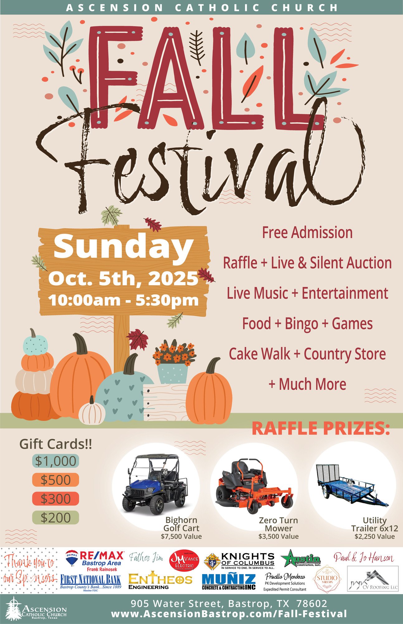 The Fall Festival at Ascension is an annual event filled with activities for the entire community. We hope you take this opportunity to get involved and get to know your fellow parishoners. We are so excited for all of the festivities we have planned and can't wait to share this unforgettable day with you.